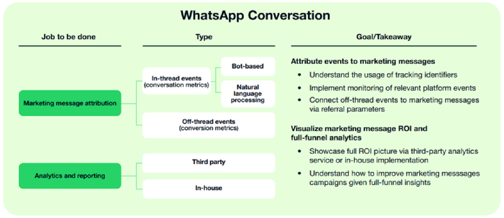 Mientras tanto, algunas mediciones de resultados indirectos, que a veces requieren una mayor integración con una herramienta de CRM, también proporcionarían información significativa (p. ej., compromiso recurrente con la cuenta de WhatsApp, compra repetida, recuento de compras, etc.).