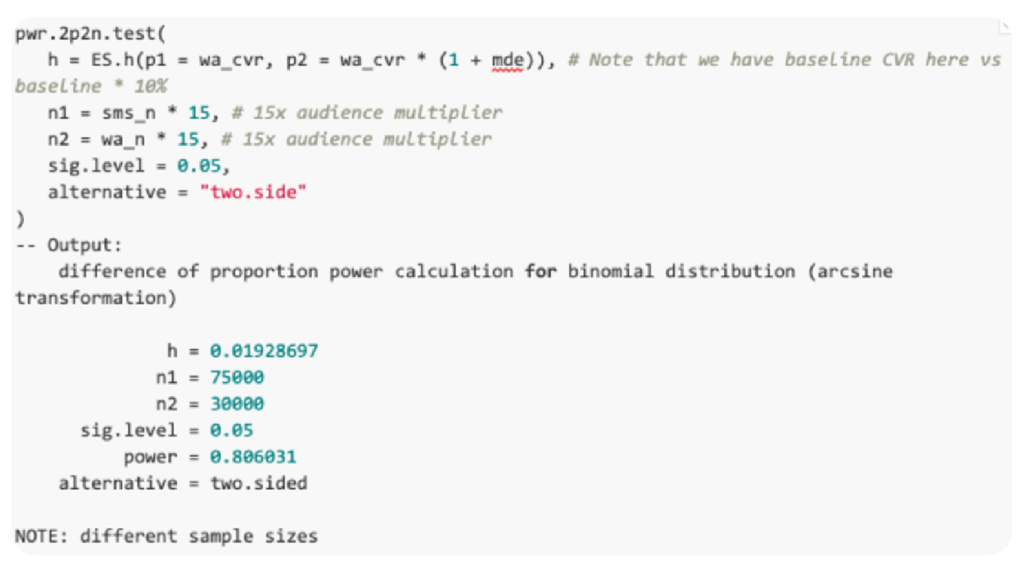 Para el ejemplo de análisis de datos de referencia, supongamos el cálculo de potencia anterior en el que enviamos mensajes a 75.000 personas a través de SMS y a 30.000 personas a través de WhatsApp, por lo que de acuerdo con las tasas de conversión presentadas para ese cálculo de potencia.