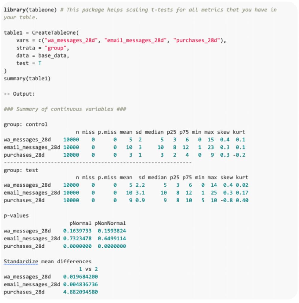 → En el ejemplo anterior, puede ver en la sección de valores p que los grupos no difieren para wa_messages y email_messages, porque el valor p es superior a 0,05. Esto es lo que buscamos.