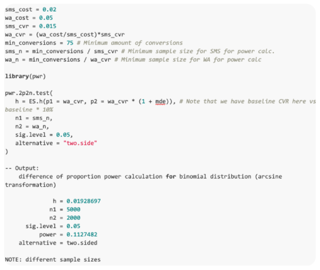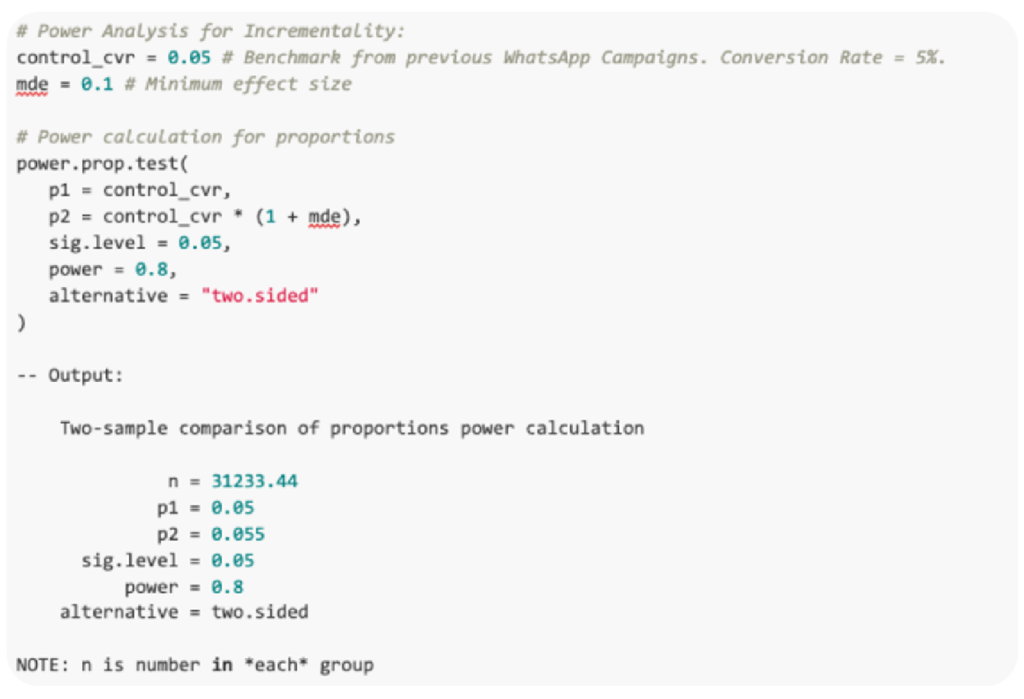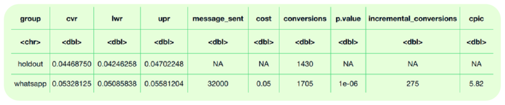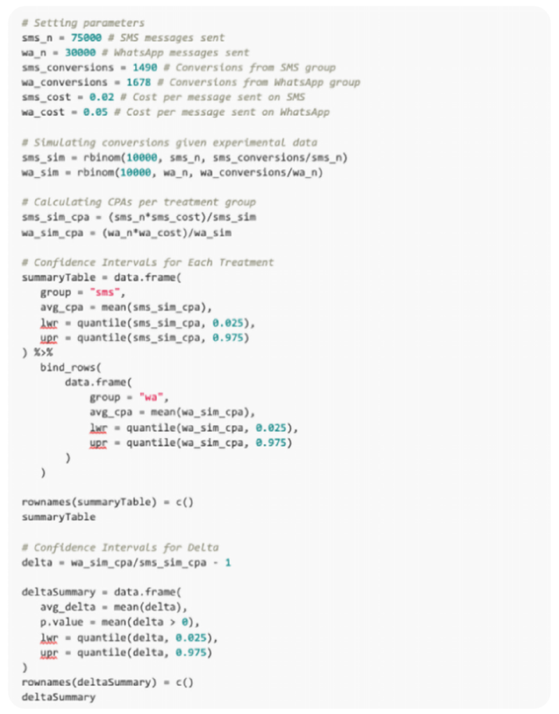 Para este ejemplo, supongamos que utilizamos el ejemplo de cálculo de potencia anterior y que un experimento con 32.000 clientes en los dos grupos de retención/prueba. El grupo de retención, en el que no se envió el mensaje, tuvo 1.430 conversiones, y el grupo de prueba, en el que sí se envió el mensaje, obtuvo 1.705 conversiones. Suponiendo un coste de 0,05 USD por mensaje enviado, tenemos el siguiente código: