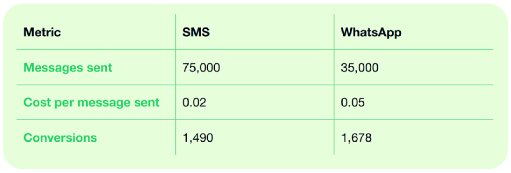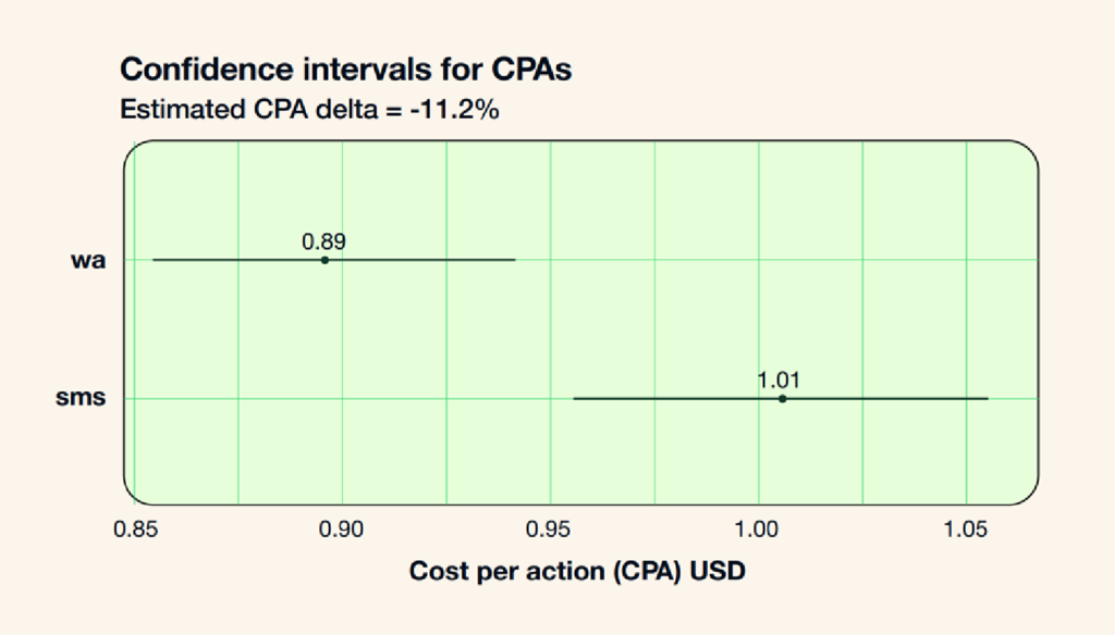 y SMS es de -11,2%, lo que muestra que cada conversión obtenida mediante WhatsApp cuesta un 11,2% menos que cada conversión obtenida mediante SMS.