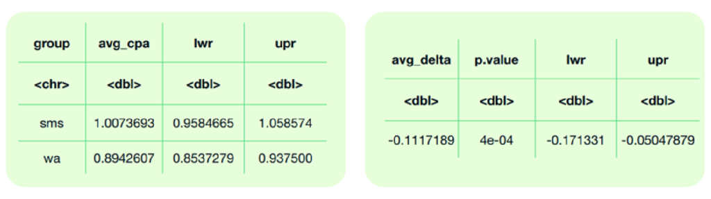 2 Comparación de los mensajes de marketing con otros canales (Tipo B): en este tipo de análisis, la atención se centra en la comparación de los mensajes de marketing con otros canales tipo de análisis, el objetivo es comparar el coste por acción (CPA), donde la acción es el evento de conversión, entre canales. El resultado de este análisis son los intervalos de confianza CPA de cada grupo, así como un valor p para la diferencia de CPA.