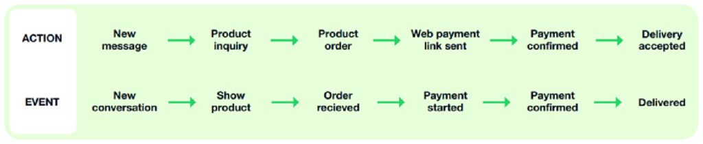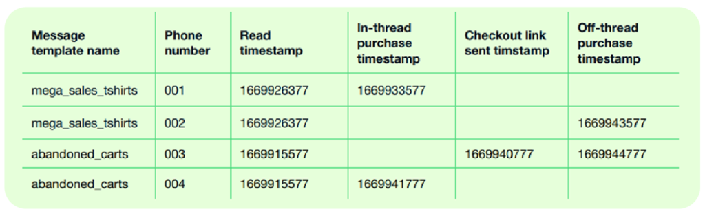 Para construir el informe de medición, necesitamos asociar la conversación iniciada a través de una campaña de mensajes de marketing de WhatsApp y los eventos de resultados empresariales producidos. Registrar y asociar correctamente los eventos puede permitir a una empresa un cuadro de mandos que demuestre claramente el ROI de los mensajes de marketing.