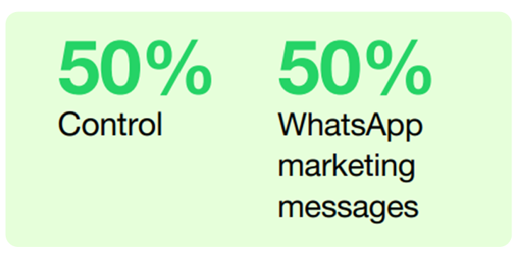 mensajes a 31.234 personas en el grupo de control (que no reciben ningún mensaje de marketing de WhatsApp) y otro grupo con 31.234 personas que recibirán mensajes de marketing de WhatsApp y otro grupo con 31.234 personas que recibirán mensajes de marketing de WhatsApp (grupo de prueba).