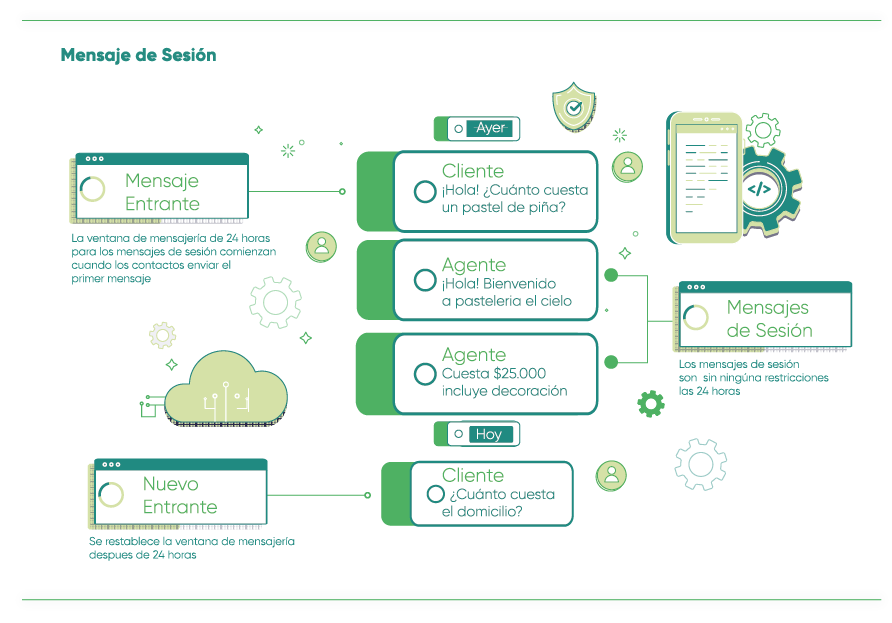 La mensajería de sesión le permite responder a los mensajes de sus contactos dentro de un plazo de 24 horas. Una vez que la ventana de 24 horas se cierra, ya no se pueden enviar Mensajes de Sesión. No es necesaria ninguna aprobación previa antes de enviar un Mensaje de Sesión, siempre que se respete la Política de WhatsApp Business y la Política de WhatsApp Commerce.