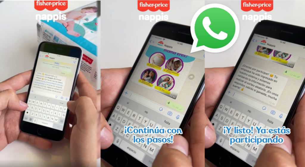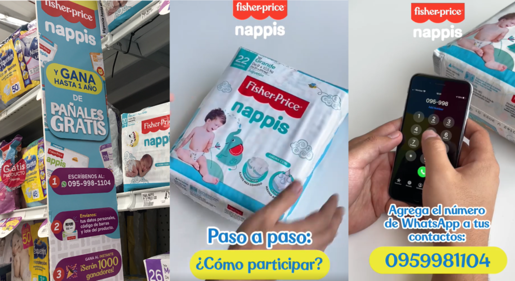 La marca de pañal Nappis ahora cuenta con un número certificado para su línea de WhatsApp donde los participantes ingresan sus datos, códigos de barras y lotes del empaque del pañal participante. Para la premiación recopilan esta información y de forma automática, se elige un ganador aleatoriamente.