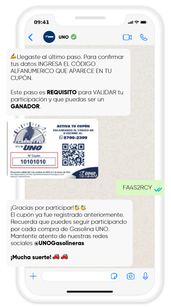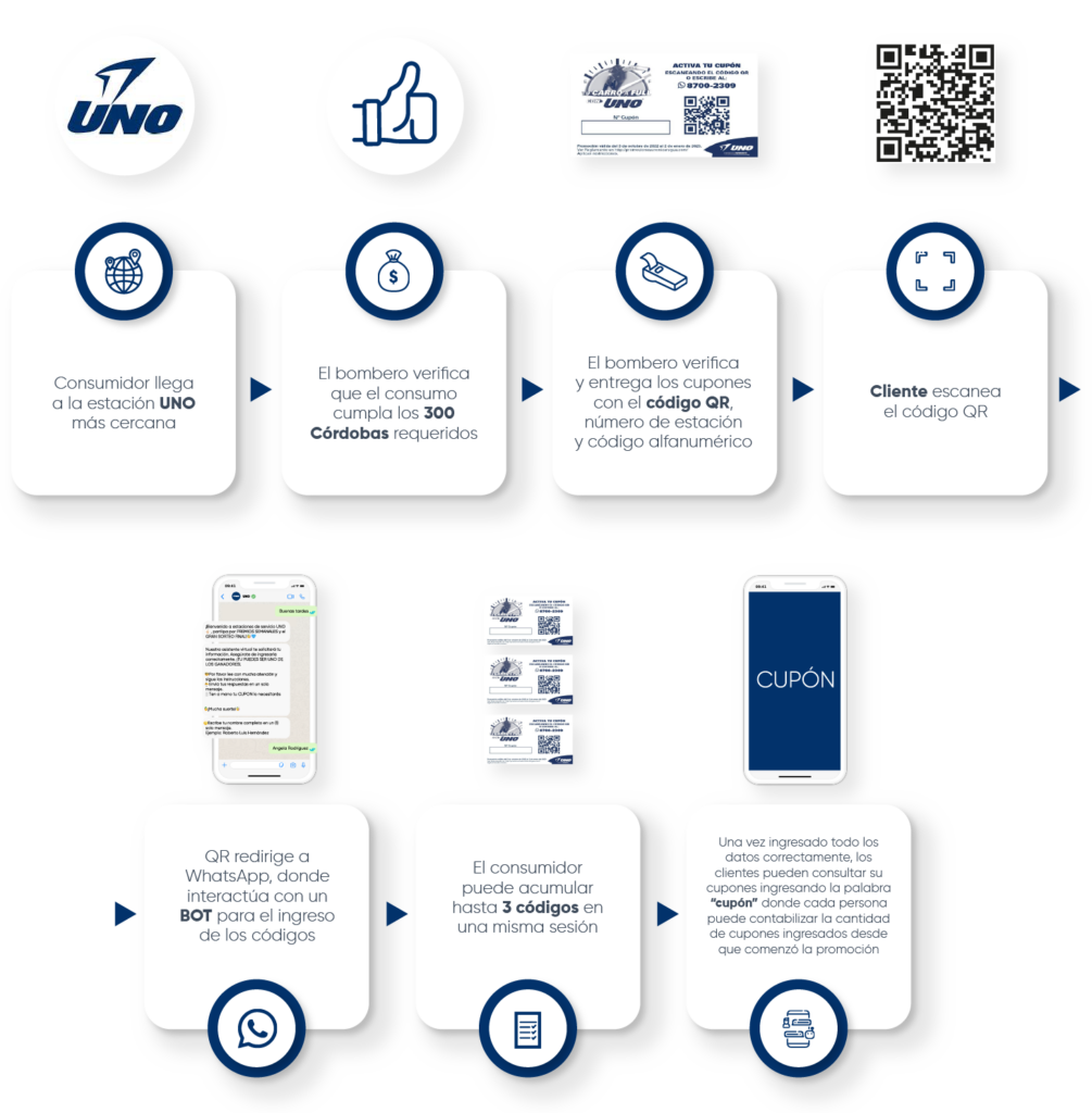 1. La promoción funcionaba de la siguiente forma: Por cada Trescientos córdobas (C300.00) en consumo de gasolina; el cliente recibía un cupón con un código alfanumérico y un QR que lo redirigía al canal de WhatsApp Oficial de UNO Nicaragua.