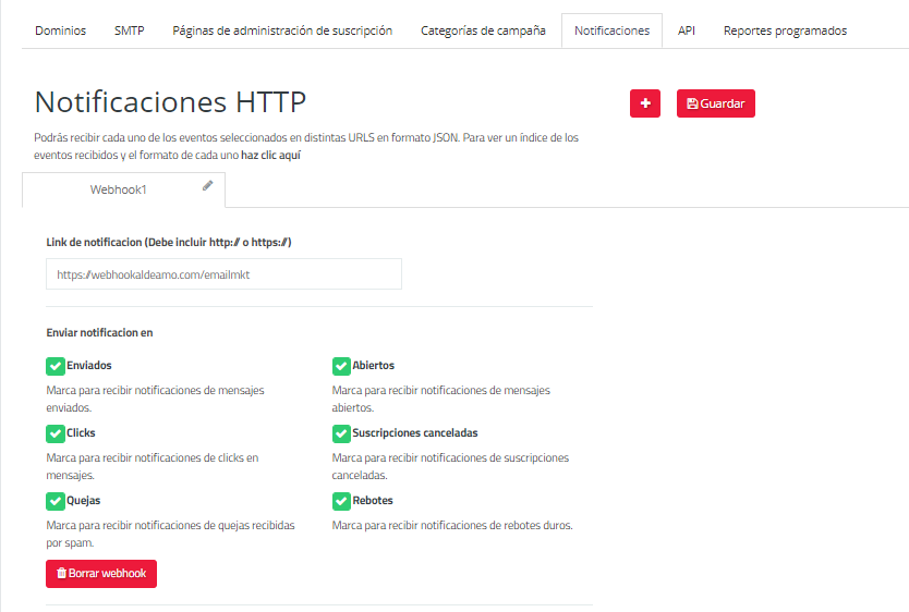 Este servicio permite el envío de notificaciones de eventos que ocurren en el producto de Email Marketing y SMTP/API, de tal forma que no es necesario solicitar información de forma periódica. El cliente debe publicar un servicio web (WS) al cual nuestra Plataforma realizará peticiones con toda la información del evento en cuestión. Los eventos enviados pueden ser de Rebotes, Clics, Quejas, Aperturas, Correos enviados o Suscripciones canceladas.