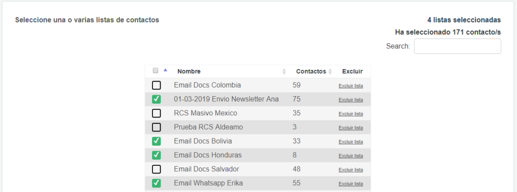 Seleccione o excluya una o varias listas de contactos para el envío de su campaña.