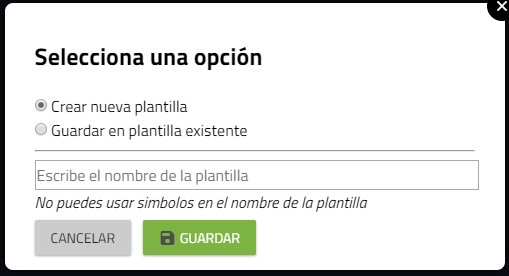 - Guardar plantilla: Entrega la posibilidad de crear una plantilla para uso posterior, Reemplazar una plantilla existente y Definir el nombre de la plantilla.