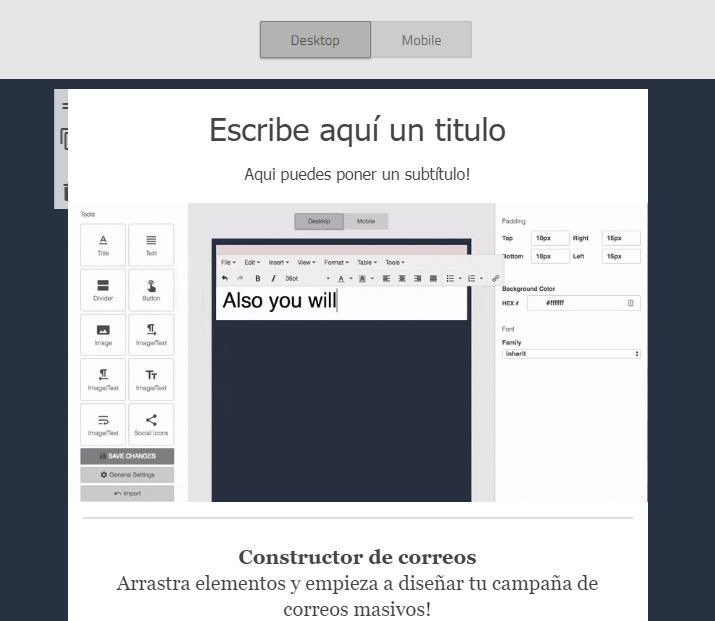 Cree un correo electrónico con nuestro editor Drag and Drop, compatible para todas las pantallas. Para acceder al editor deberá dar clic en el siguiente recuadro.