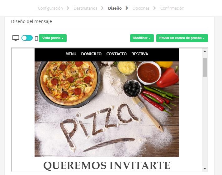 - Diseño: Previsualice el contenido de su correo electrónico y en caso de querer modificarlo, regrese a ese paso.
