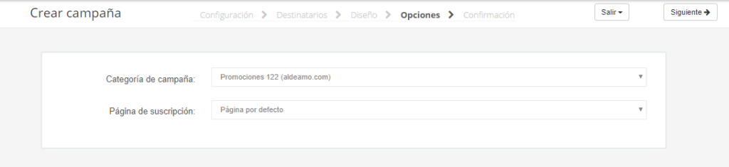 Seleccione la categoría de campaña y la página de suscripción que utilizará para este envío. Este paso no es obligatorio.