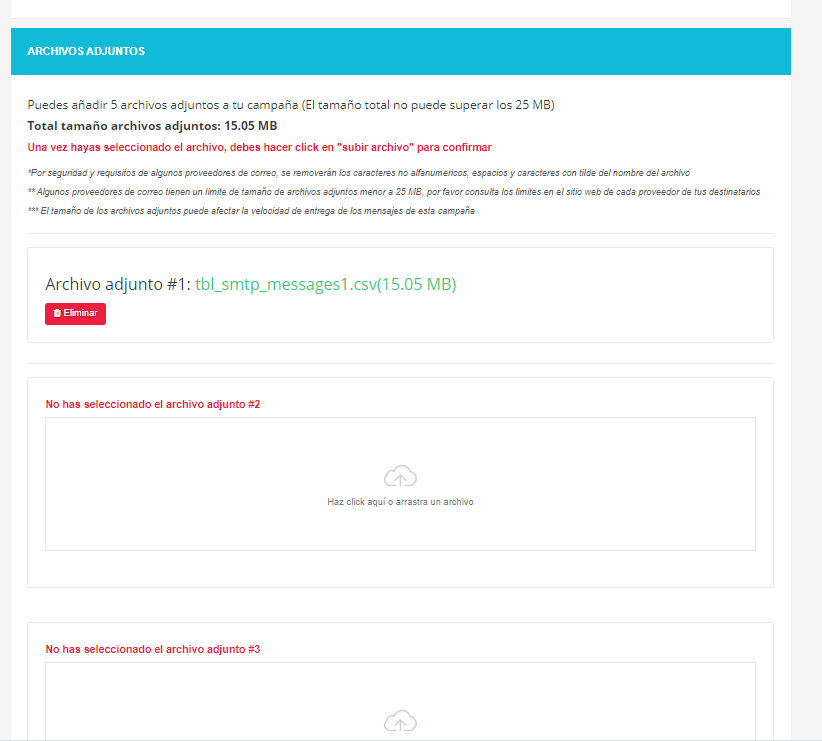- Archivo adjunto: Puede añadir hasta 5 archivos adjuntos a su campaña de máximo 25 Mb de peso por archivo individual y por archivos múltiples. Esta restricción se efectúa para mitigar el riesgo de spam. Las extensiones permitidas para adjuntar archivo son: pdf, png,