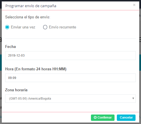 Si desea programar su campaña, presione el botón Programar y seleccione la opción de programación que desea. Puede ser el envío programado sólo una vez o el envío programado