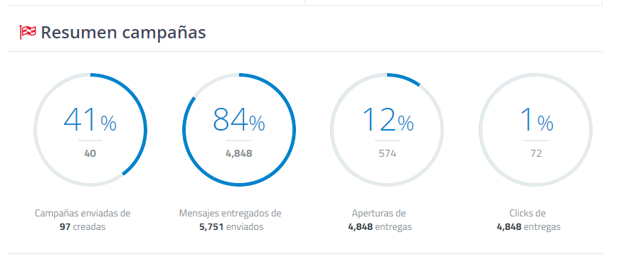 - Número de campañas enviadas y porcentaje con respecto a las campañas creadas.