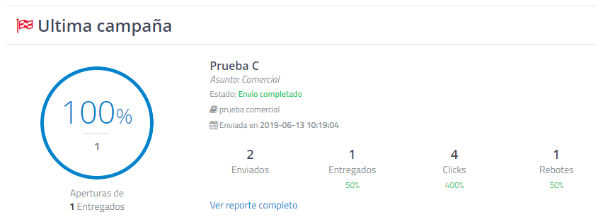 Al finalizar esta sección, encontrará un resumen de la última campaña realizada en su usuario con los siguientes datos:
