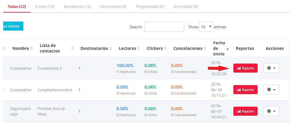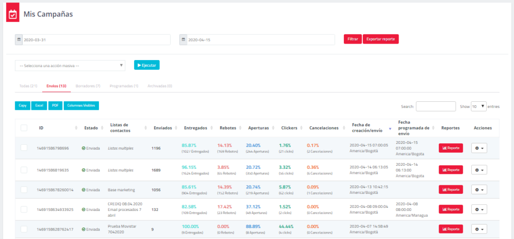 Revise el estado de la reportería de sus campañas. En esta sección encontrará la posibilidad de filtrar por fechas específicas, ver todas las campañas, enviadas, borradores, incompletas, programadas y archivadas.