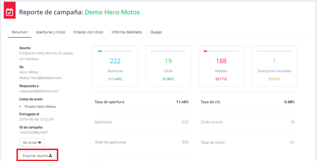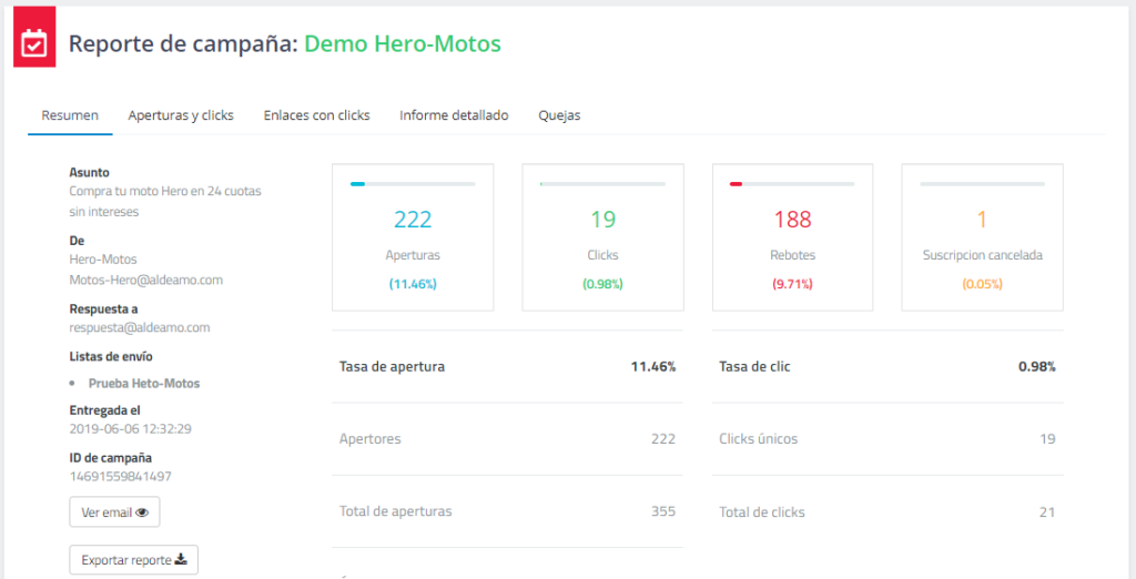 - Clics: Cantidad y porcentaje de aperturas de la campaña.