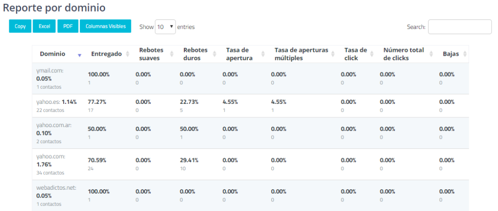 En la parte inferior del resumen encontrará un reporte por dominio. Este reporte mostrará datos de cada dominio sin importar la cantidad de dominios que contenga su campaña.