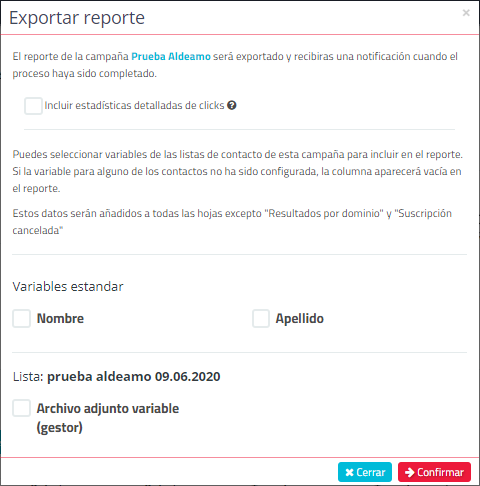 Podrá descargar un reporte consolidado de campaña y escoger si lo quiere con datos correlacionados cargados previamente dentro de la Lista de Contactos.