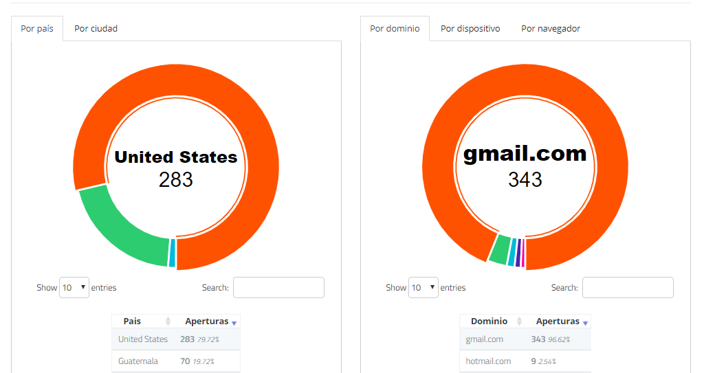 En este módulo también entregan cantidad y porcentaje de aperturas con respecto al país, la ciudad, el dominio, el dispositivo y el navegador de la campaña.