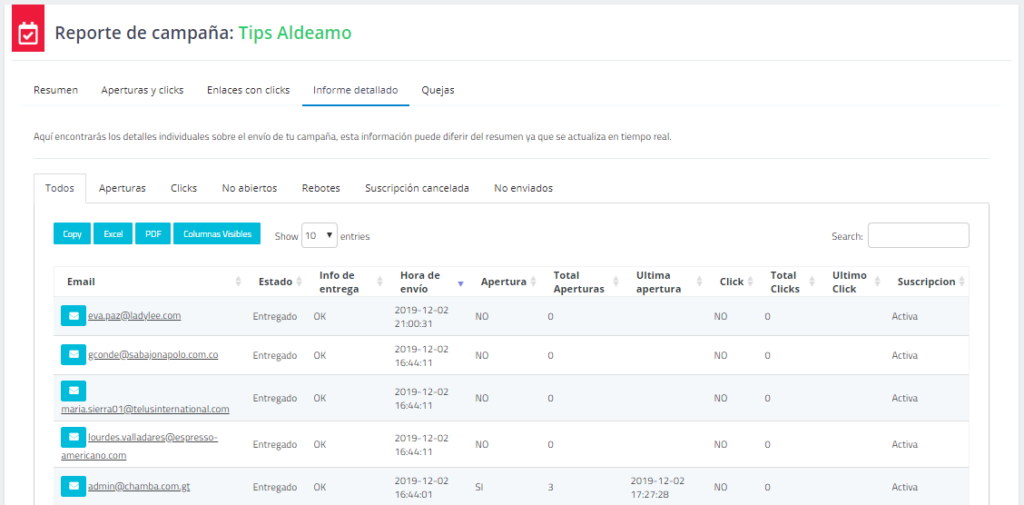 El informe detallado muestra una tabulación completa para todos los datos de las campañas, las aperturas, los clics, los correos no abiertos, los correos con rebotes suaves, duros y las suscripciones canceladas.