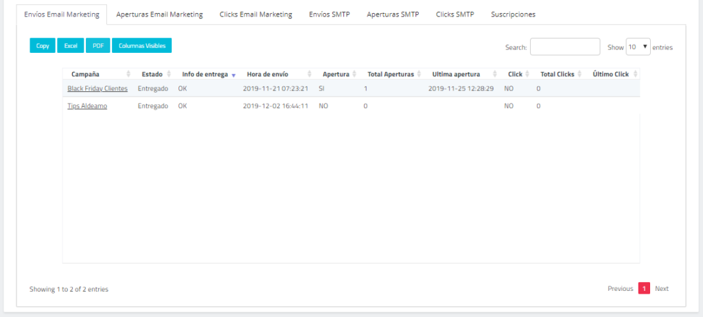- Exportar reporte: Generará un archivo de Excel con todos los datos contenidos de la campaña.