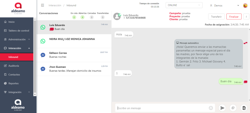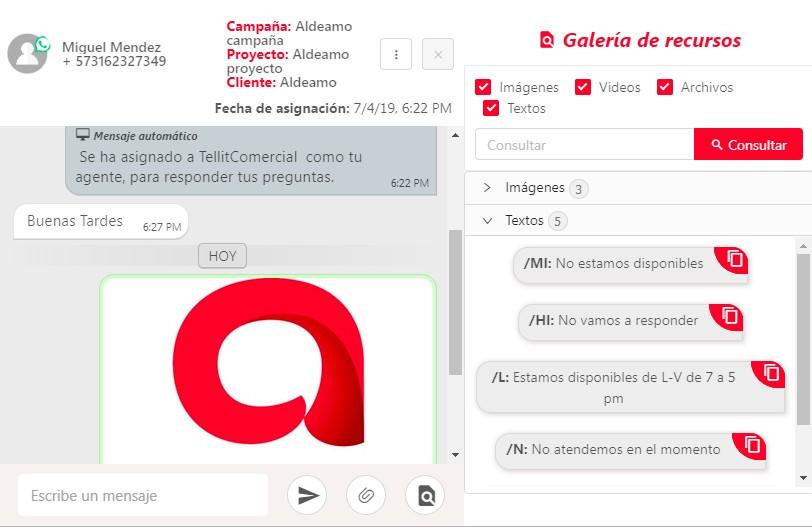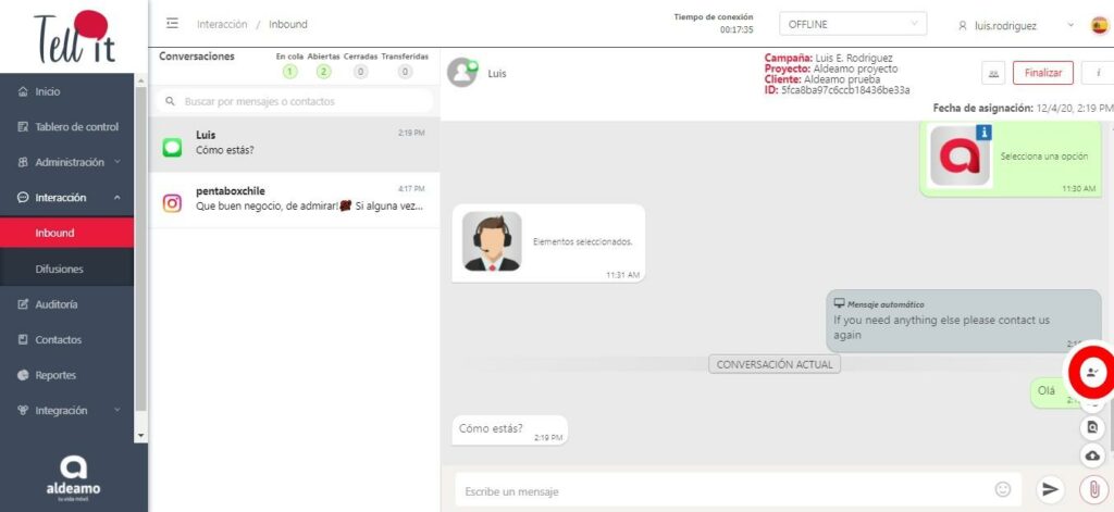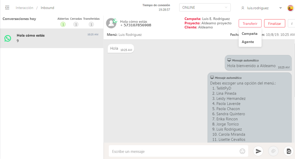 Cuando se despliega la conversación podrás observar a cuál campaña, proyecto y cliente está