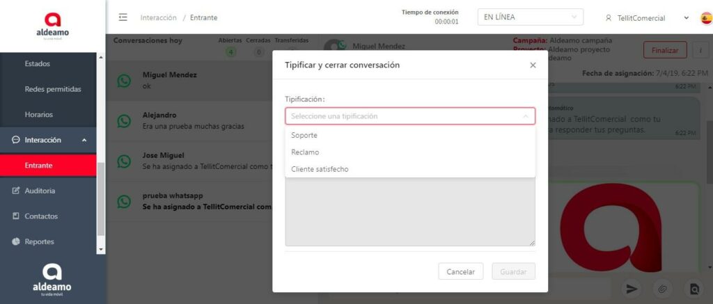 En esta ventana selecciona la tipificación con la que vas a clasificar la conversación según las tipificaciones de finalización asignadas en la creación de la campaña. Si durante la conversación se agregó una nota, en este espacio puedes visualizarla. Presiona el botón Guardar.