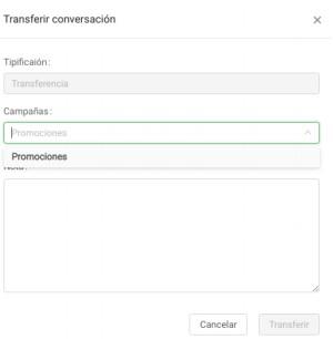 En esta ventana, verás por defecto el campo tipificación con el nombre “Transferencia”, en el campo Campañas puedes ver el nombre de las campañas a las cuales puedes transferir la conversación del usuario (sólo se pueden transferir a campañas que estén asociadas al mismo número de canal). En el campo Nota debes colocar los motivos por los que se realiza la transferencia de la conversación.