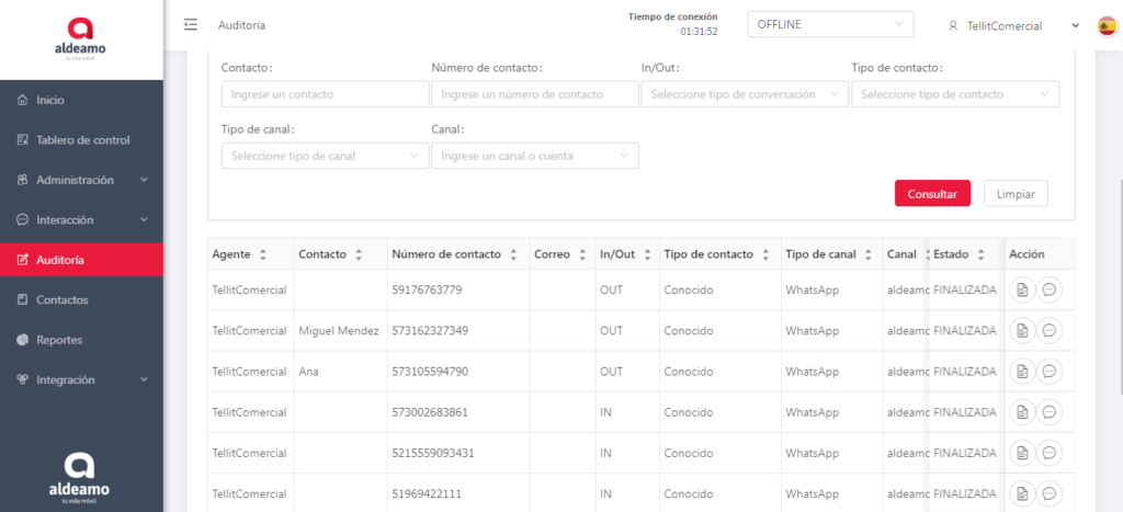 - Contacto: Nombre del contacto grabado en forma automática o modificado por el agente.