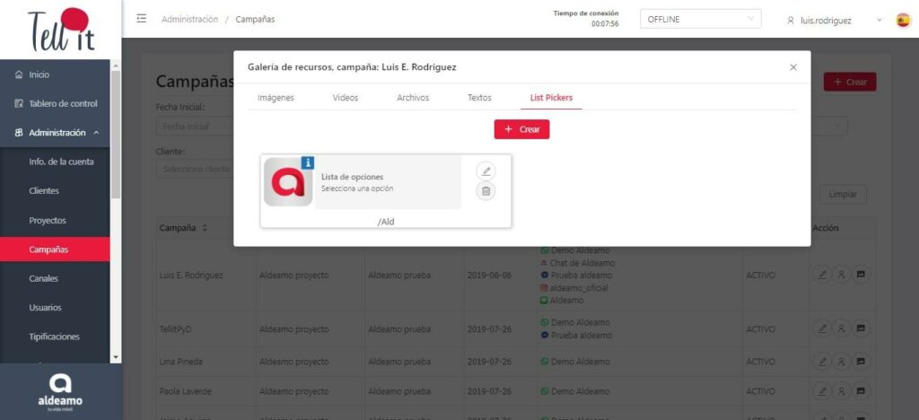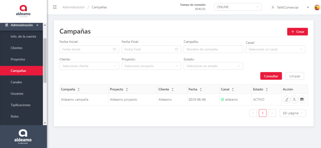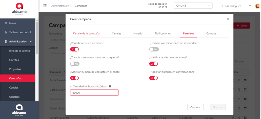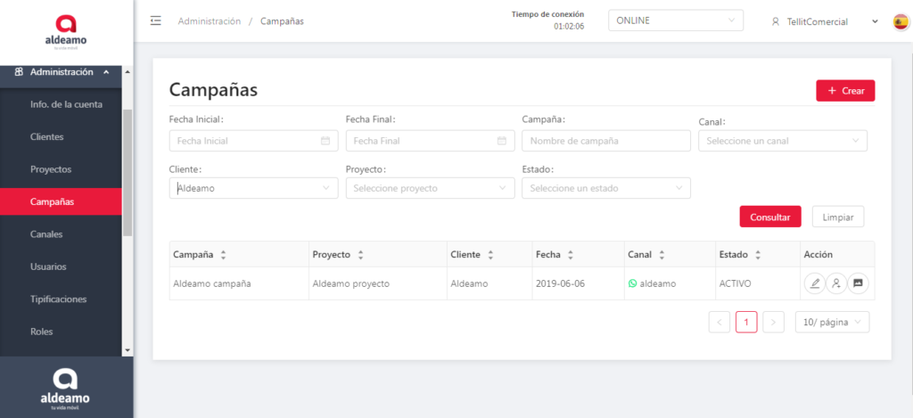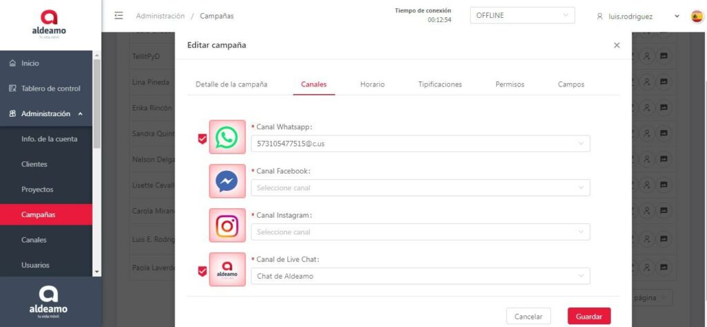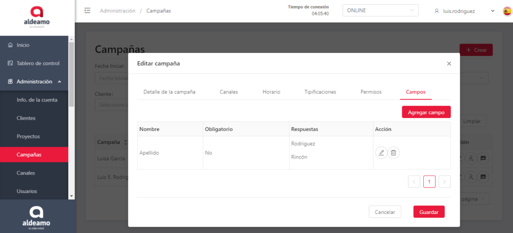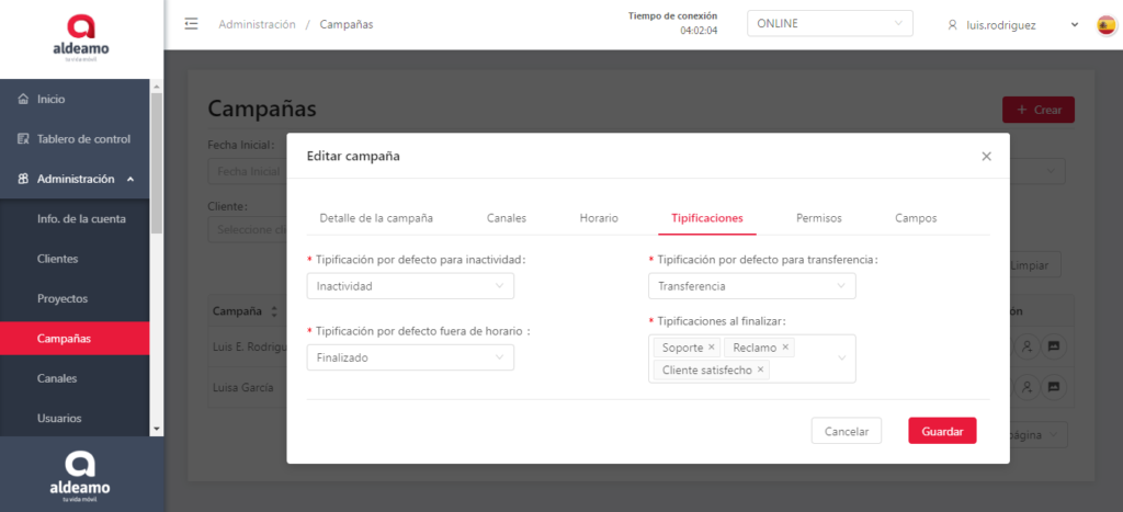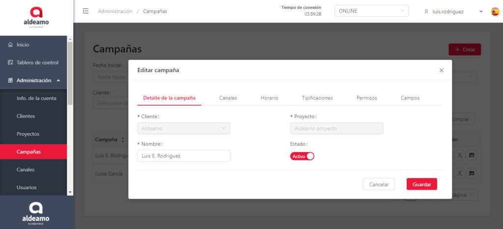 En esta pantalla puedes editar los canales que tiene asignados la campaña, el nombre de la campaña, el horario, las tipificaciones y cambiar el estado (activo o inactivo).