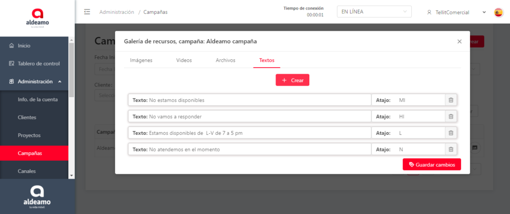 En esta ventana puedes asignar o desasignar los recursos a una campaña y puedes asignar los Atajos.