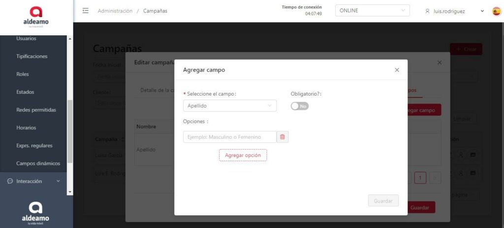 Opciones: Se habilitará siempre y cuando al crear el campo dinámico hayas escogido la opción “Campo de Selección”. Funciona como una lista desplegable.