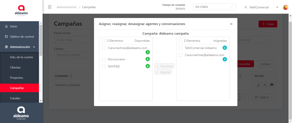 En esta ventana puedes asignar o desasignar los usuarios a una campaña, puedes aumentar o disminuir la cantidad de conversaciones que puede atender un agente en la campaña. Dependiendo de la configuración de los usuarios en cuanto al máximo de conversaciones que pueden gestionar en simultáneo, podrás dejar usuarios disponibles con conversaciones para ser usados en otras campañas, como se puede observar en el gráfico.
