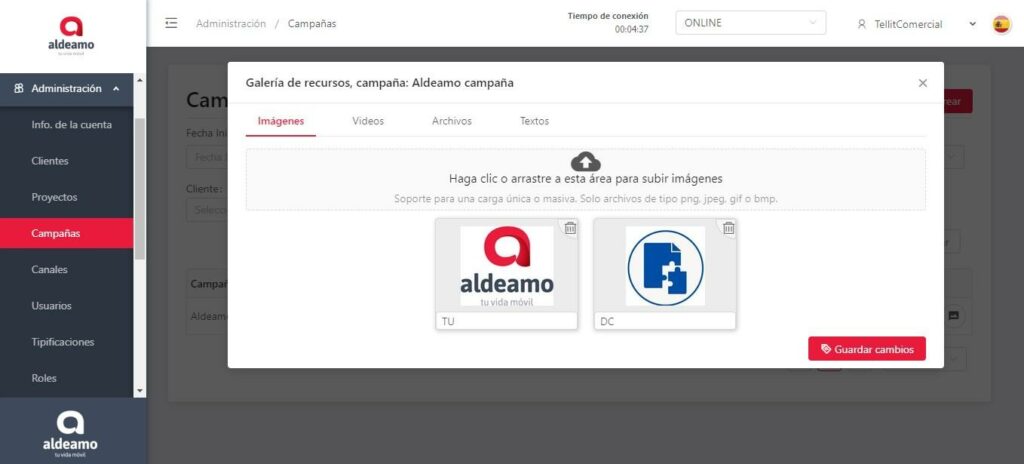 Esta opción la encuentras dentro del maestro campañas, en el lado derecho puedes observar el botón con la figura de galería, le das clic y te arrojará la siguiente pantalla: