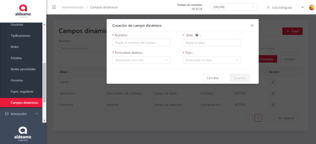 Para crear un Campo dinámico debes dar clic en el botón +Crear, se mostrará la siguiente pantalla: