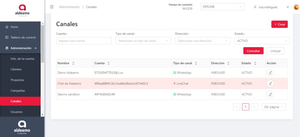 Tipo de canal: Te informa el tipo de canal creado, para este ejemplo es WhatsApp.