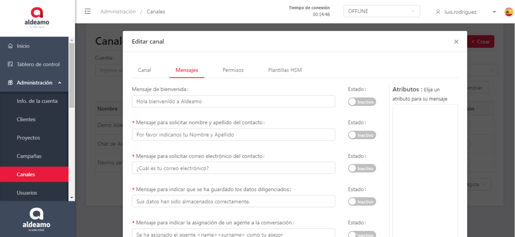 Para el segundo paso de la configuración del canal deberás Configurar los mensajes automáticos asociados.