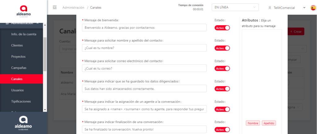Nota: Para la personalización de los mensajes con el Nombre y Apellido, puedes realizarlo directamente en el mensaje con la siguiente sintaxis , o dando clic a los botones de Nombre y Apellido ubicados en la ventana de atributos del costado derecho de la edición del canal: