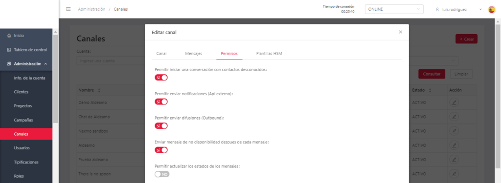 - Permitir enviar notificaciones (Outbound): Si habilitas este botón, permitirá a los agentes enviar notificaciones a los contactos por medio de una aplicación externa.