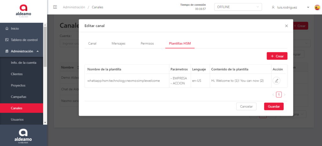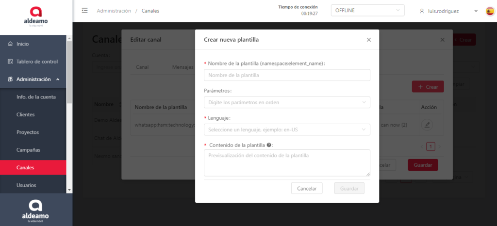- Nombre de la plantilla: Nombre técnico de la plantilla. Ejemplo: whatsapp:hsm:technology:nexmo:simplewelcome