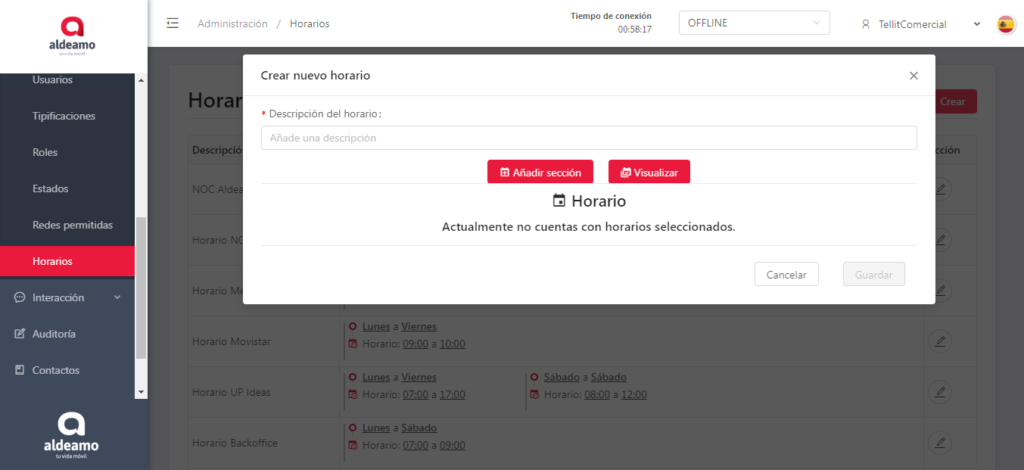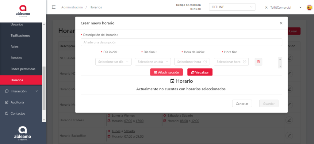 • Hora fin: Es la hora final del horario en el que trabajan los agentes/usuarios.