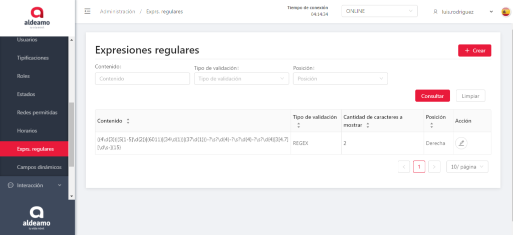 Para crear una Expresión Regular debes dar clic en el botón +Crear, se mostrará la siguiente