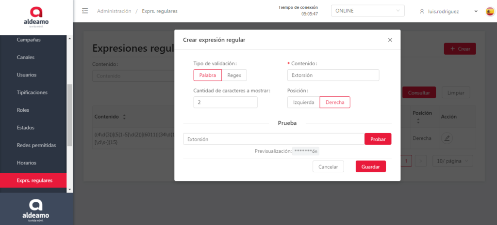 - Tipo de validación: Te muestra el tipo de validación de expresiones regulares que quieres que sean restringidas. Si la expresión que quieres ocultar es sólo de formato alfanumérico, selecciona “Palabra”. Si la expresión que quieres ocultar es de formato Regex (Tarjeta de