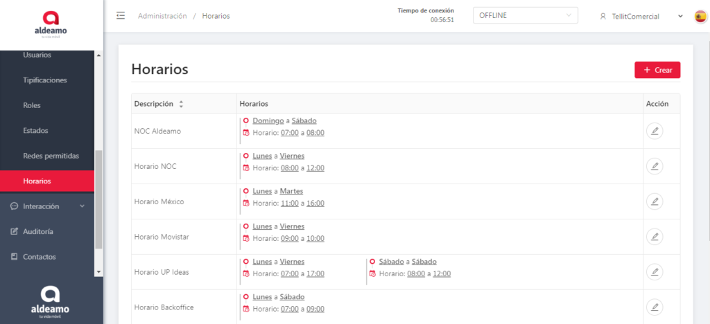 Horarios 6.11 HorariosEsta opción la encuentras desplegando el menú interactivo de Administración, en este maestropuedes encontrar los horarios que tienes creados para utilizar en las campañas. Aldeamo.ai2021-07-01T10:37:48-05:00 Share on the networks! FacebookTwitterLinkedInRedditWhatsappGoogle+TumblrPinterestVkEmail