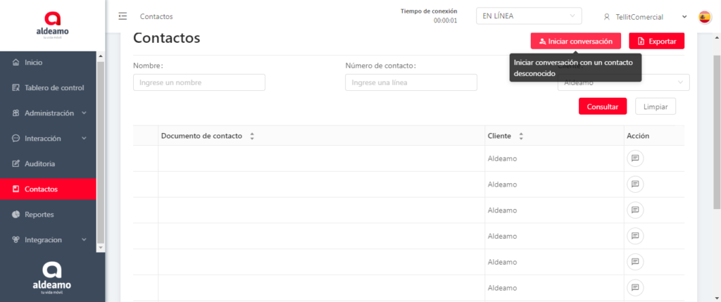 El agente puede iniciar una conversación con un contacto que no esté almacenado en la tabla de contactos dando clic en el botón Iniciar conversación al lado del botón de Exportar.