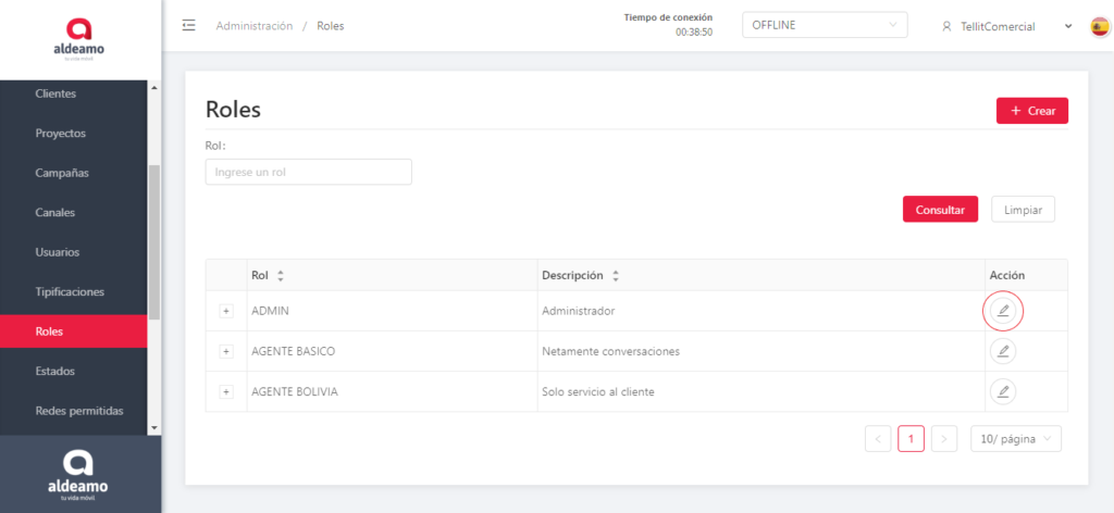Para editar un Rol, debes dar clic en el botón que tiene la imagen del lápiz y nos arroja lo siguiente: