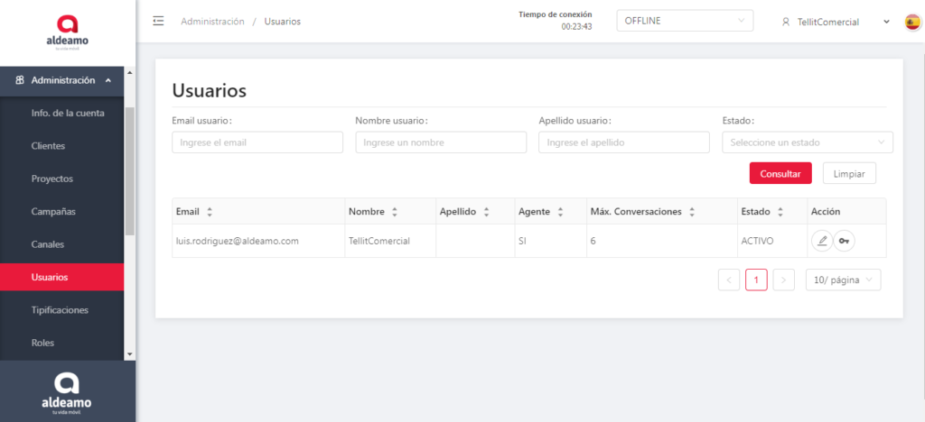 La creación o edición de los usuarios (correo y número máximo de conversaciones) solo puede ser realizada por el área técnica de Aldeamo.